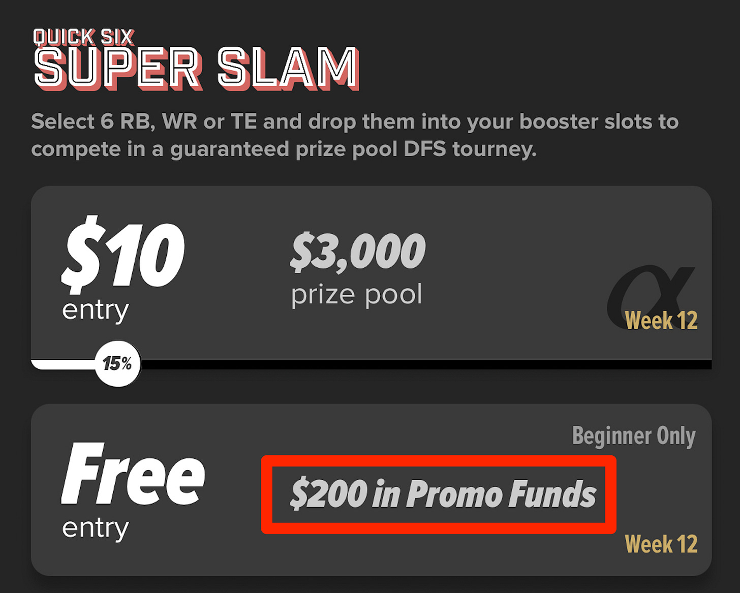 FastDraft has upgraded the free Quick Six Super Slam with a boosted prize pool of two hundred dollars in promo funds paying out through fifth place. Pick your favorite six players in the fastest DFS contest available and jump into the action this week. Terms apply.