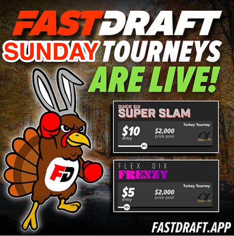 FastDraft’s Turkey Day Tournaments filled early, but don’t worry! The Sunday Quick Six Super Slam and Flex Six Frenzy tournaments are now LIVE with $4,000 in prizes up for grabs.