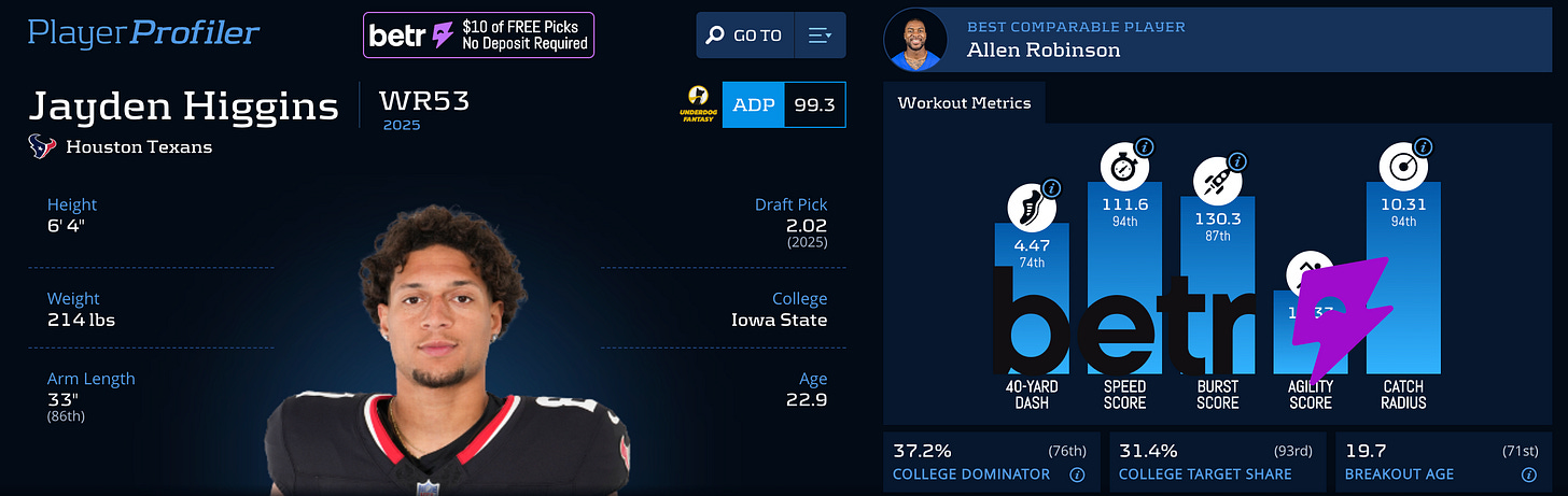 Jayden Higgins has the size and athleticism to challenge Nico Collins for alpha status in Houston. Coming off 9 targets in Week 12, Higgins should post more than 3.5 receptions at Indianapolis. Play Higgins on Betr with promo code: PLAYERPROFILER