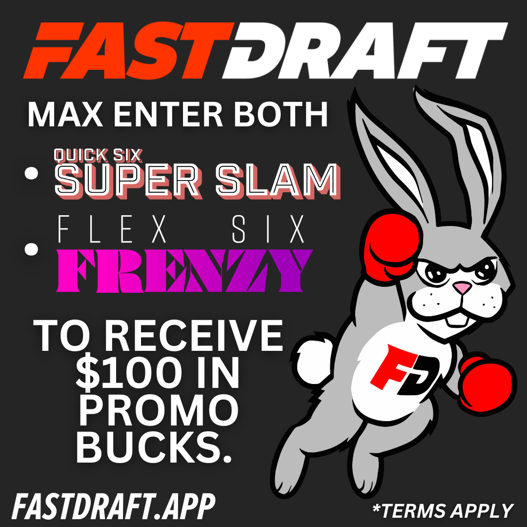Enter both the Flex 6 Frenzy and Quick Six Super Slam tournaments this week and get $100 in FastDraft promo funds. Just post your favorite lineup in our Discord “Rate My Team” channel to qualify. Terms apply.