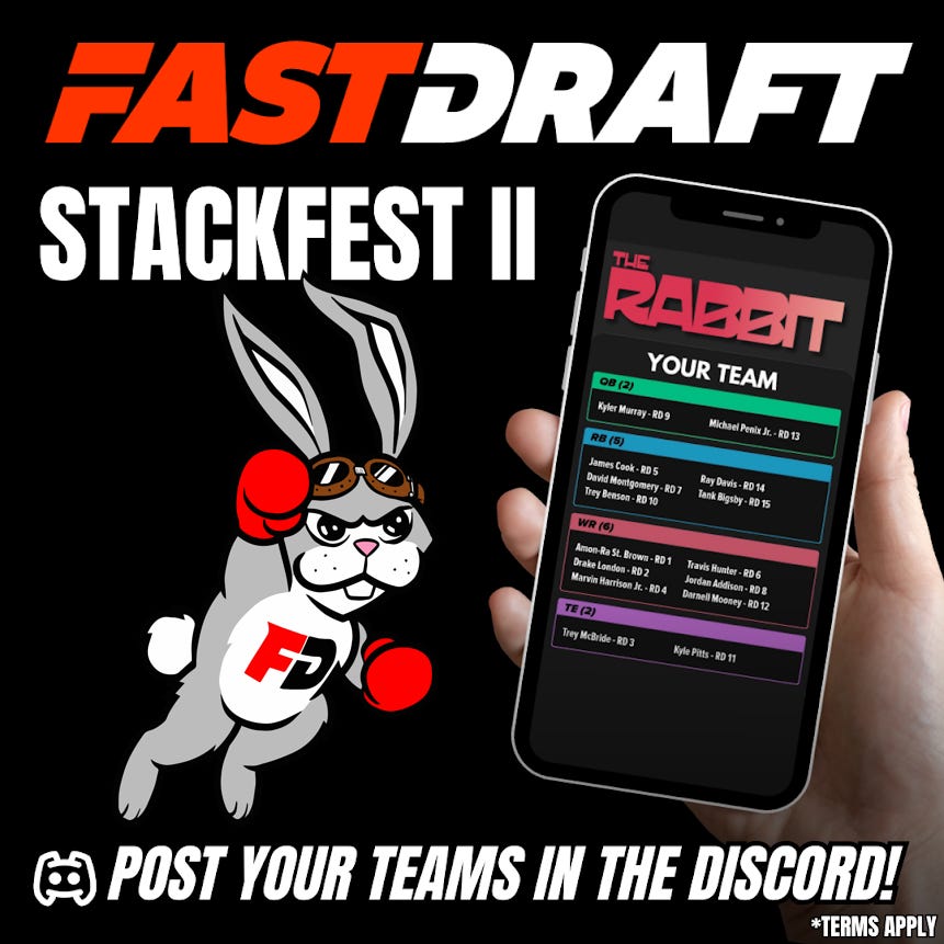 Join the FastDraft Rabbit tournament on FastDraft Friday, August 22nd and draft a team featuring two triple stacks (QB plus three position players). Post your team to the FastDraft Discord "Rate-My-Team" channel (https://discord.gg/VPzXdSA5eV) to be eligible to win this week's $250 promotional giveaway.