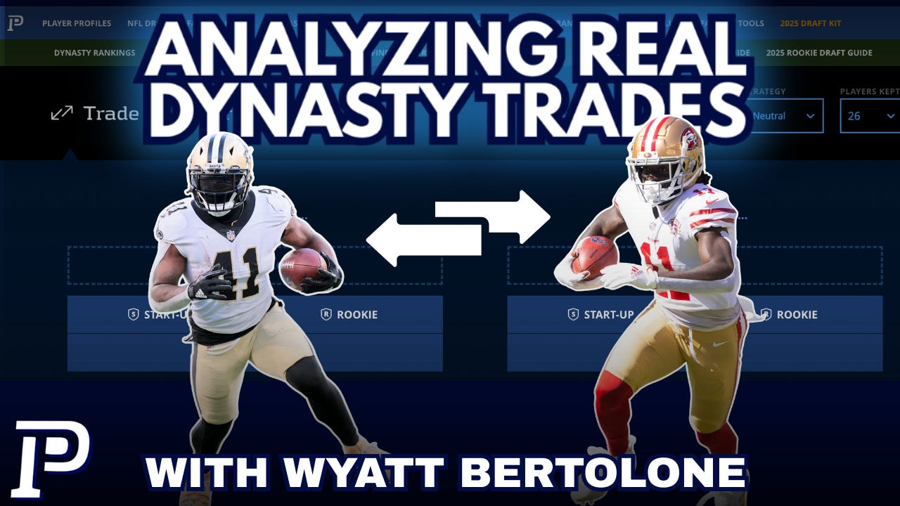 Wyatt Bertolone uses PlayerProfiler’s Trade Finder Tool to examine recent dynasty trades and how they can reshape your negotiations. Stay sharp and find value before your league mates do.