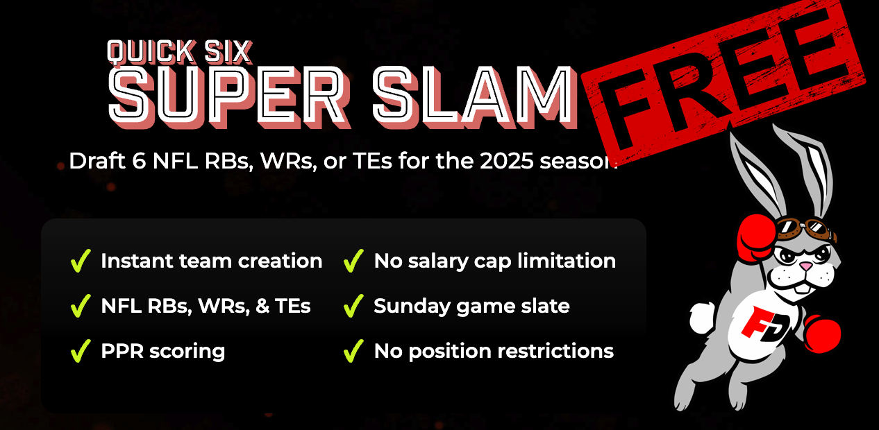 Play All-Flex DFS for $100 in promo funds by entering FastDraft’s Quick 6 Super Slam today. Select your favorite 6 flex plays on the Sunday slate, assign a few boosters and create teams in less than 1 minute.